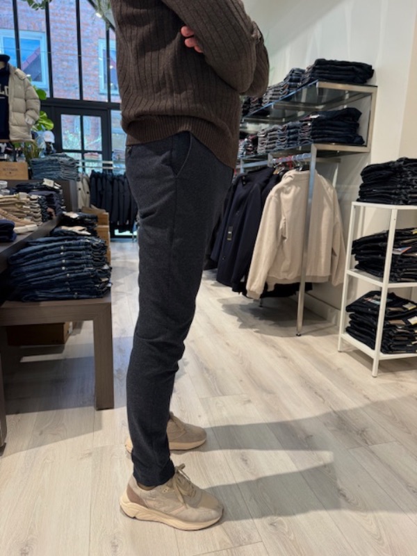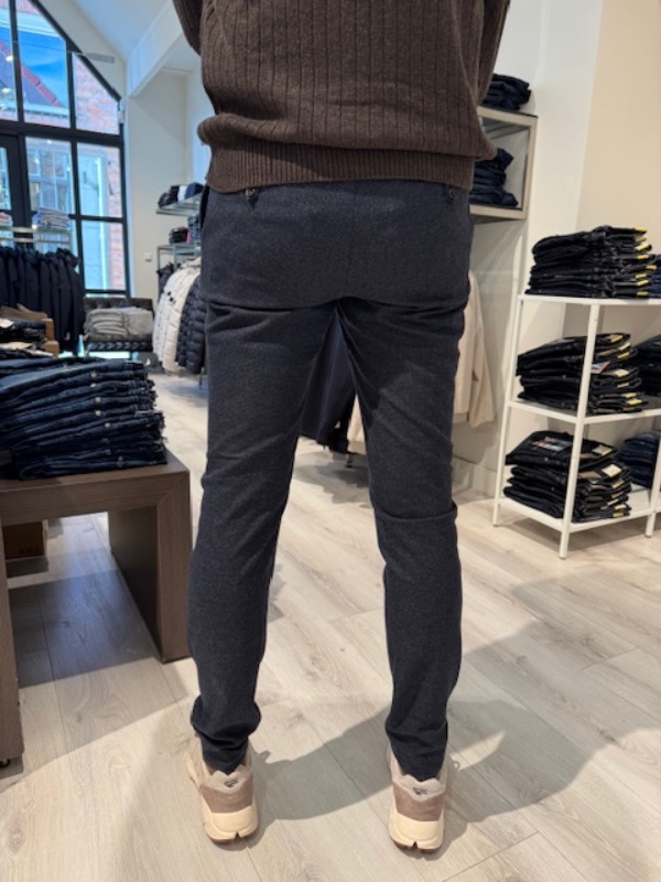 Blauwe chino in lengte 36 van Alberto, slim fit model. De broek heeft een licht aangestoten kwaliteit. Het is een beetje een flanel achtige kwaliteit. Lekker warm voor de winter. Hij is gemaakt van 39% wol, 33% polyester en elastan. De broek heeft een kleun blauw grijs ruitje.