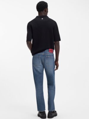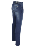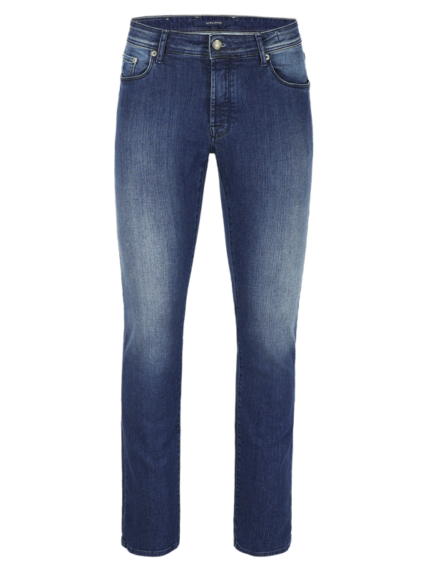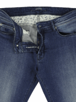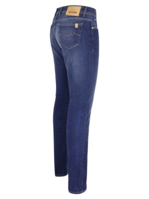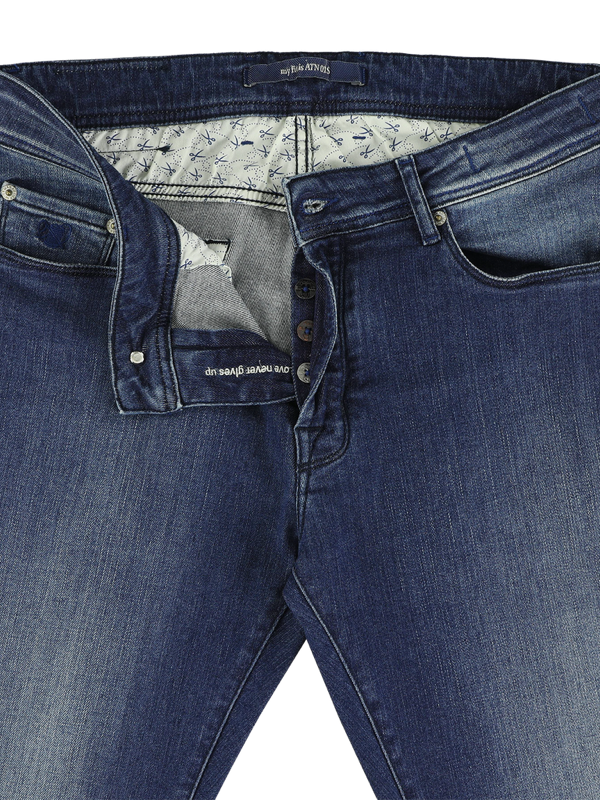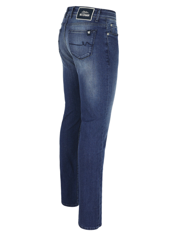 Blauwe jeans van Atelier Noterman, lengte 32. De jeans wordt gemaakt in Portugal op een zo milieu vriendelijke manier. Super mooie kwaliteit jeans, met knoop en ritssluiting. Deze donker blauwe jeans heeft een donker blauwe afwerking op de achterzakken. Gemaakt van 97% katoen en 3% elastan. Artikelnummer A42 van Atelier Noterman.