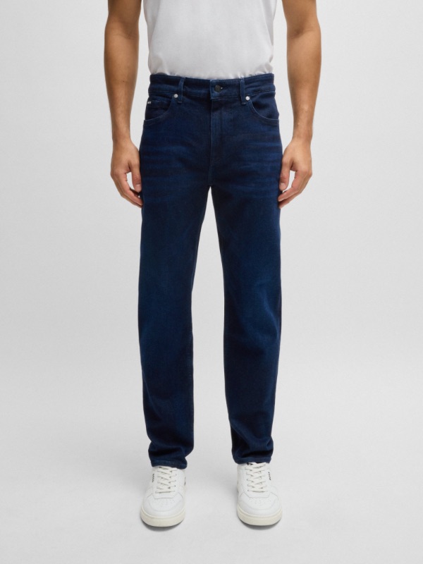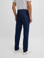 Donker blauwe kleur jeans van Hugo Boss in model RE.MAINE. Regular fit. De jeans heeft een cashmere-touch. Mooie nieuwe logo’s op achterzak en op label bij riemlus. Artikelnummer 50520854 van Boss black label. Lengte 30.