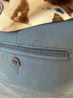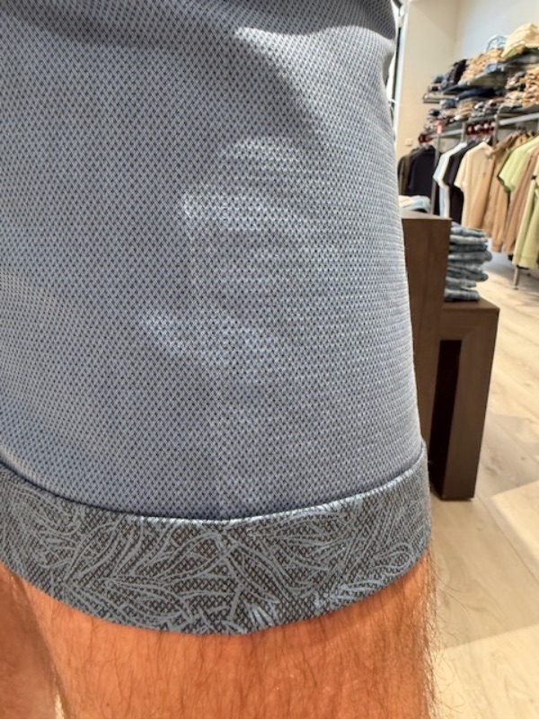 Midden blauwe korte broek. De shorts is gemaakt van 61% katoen en 33% polyester en 6% elastan. Er zit een klein werkje in de stof. De onderzijde van de pijp heeft een afwerking met een ander stofje. De korte broek valt onder de 2 voor 125 euro aanbieding. Mix-and-match.