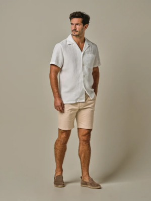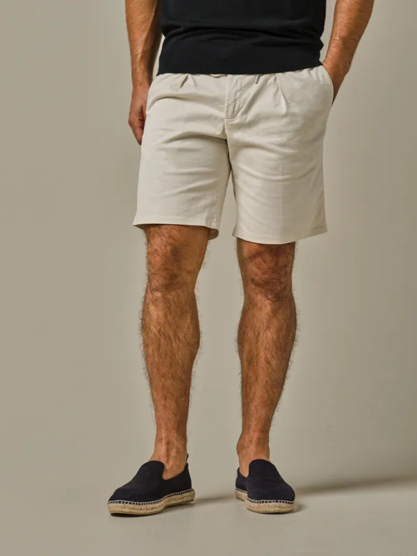 Beige shorts van Profuomo, 97% katoen en 3% elastan. De korte broek is garment dyed voor een uniek, licht onregelmatig kleureffect met een relaxte vintage-geïnspireerde uitstraling. Katoenen stretchstof voor bewegingsvrijheid. De shorts is gemaakt van een europese stof en heeft riemlussen en een elastische tailleband. Het koord kan zowel in als uit de short gedragen worden.