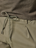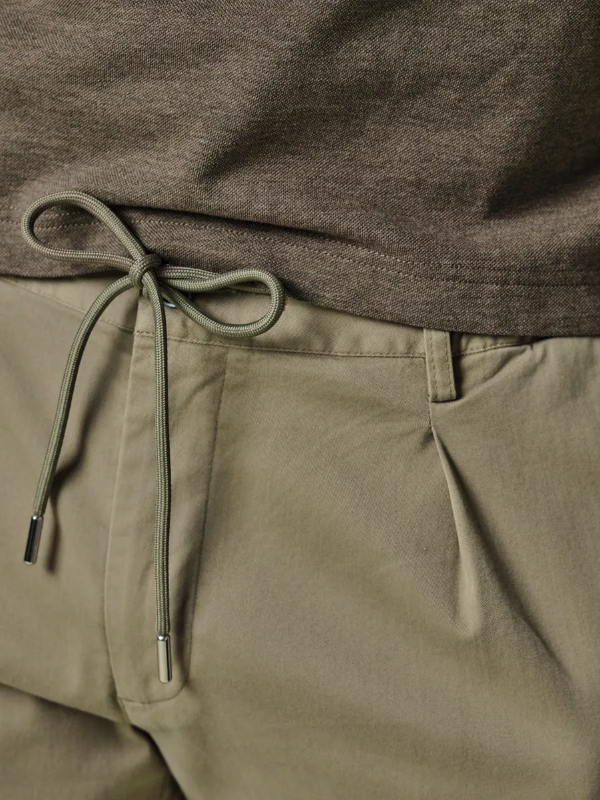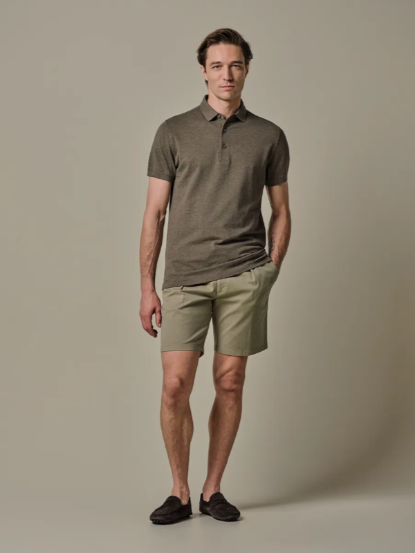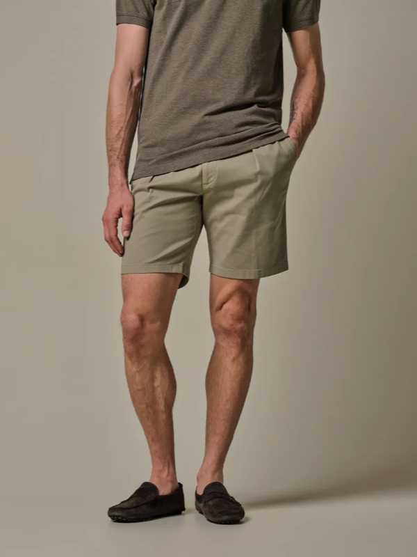 Army green shorts van Profuomo, 97% katoen en 3% elastan. De korte broek is garment dyed voor een uniek, licht onregelmatig kleureffect met een relaxte vintage-geïnspireerde uitstraling. Katoenen stretchstof voor bewegingsvrijheid. De shorts is gemaakt van een europese stof en heeft riemlussen en een elastische tailleband. Het koord kan zowel in als uit de short gedragen worden.
