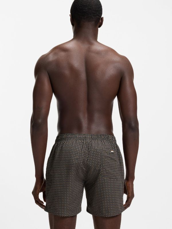 Zwarte zwembroek van Hugo BOSS. De broek heeft een klein werkje. Regular fit pasvorm. Deze zwemshorts van BOSS Menswear van natuurlijk, sneldrogend materiaal. Kenmerkend streepdetail aan de achterkant. Dit product bevat ten minste 80% duurzamere grondstoffen. Dit product is deels gemaakt met gerecyclede polyamide.
