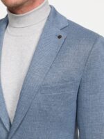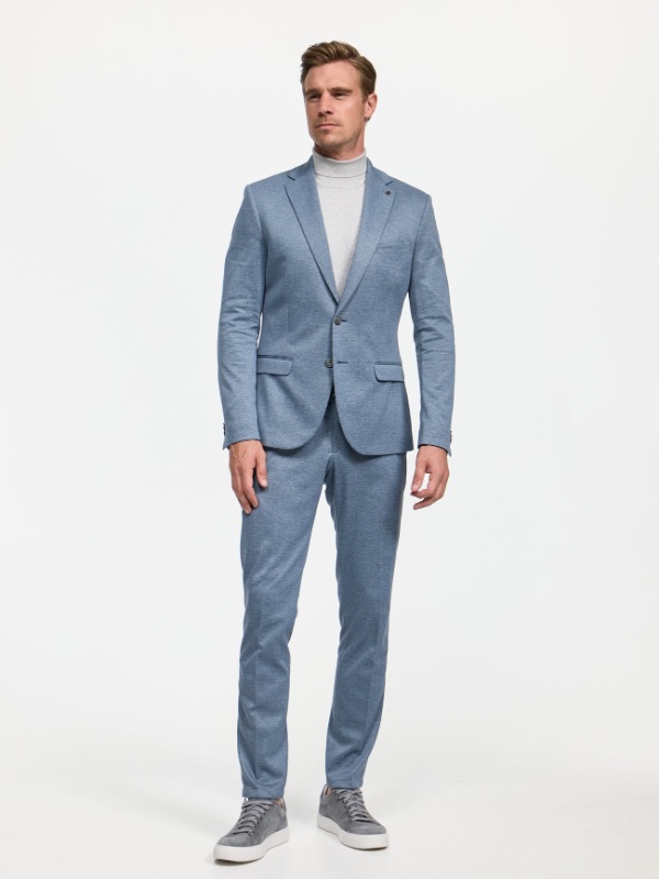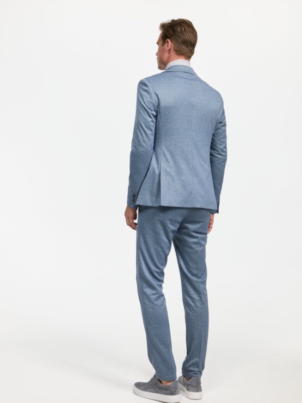 Blauw colbert van Zuitable, slim fit model. Super hip jasje met stretch, waar we ook een bijpassende chino bij hebben. Dus ook leuk als sneaker suit te dragen.