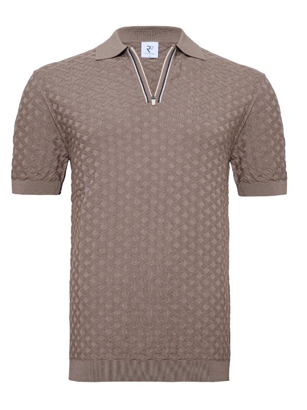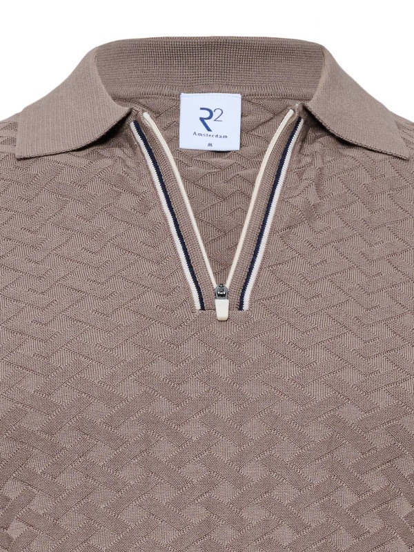 Bruine polo mat ritje van R2 Amsterdam. Slim fit polo. De polo heeft een leuke verwerking langs de rits. Klein ritje.