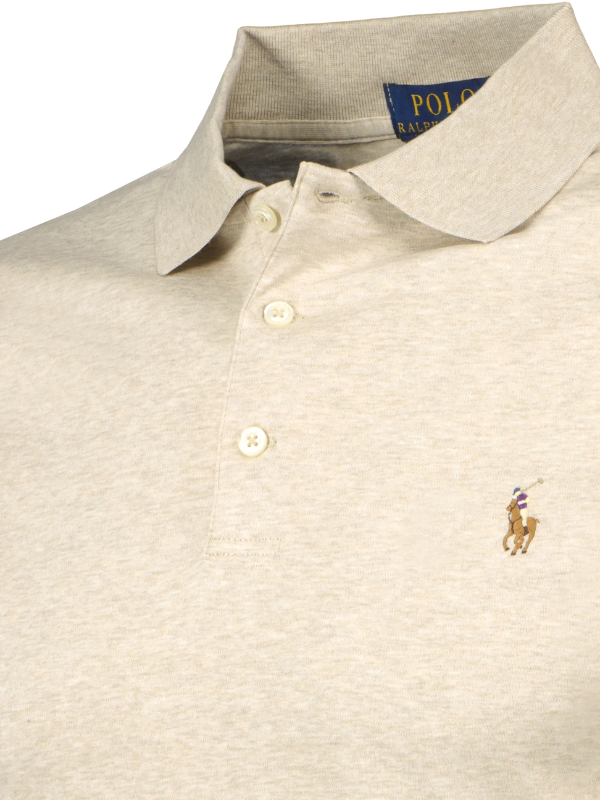 Beige gêmeleerde polo van Polo Ralph Lauren, custom fit pasvorm. Deze polo is gemaakt van 100% katoen. Draagt als een t-shirt. Heerlijke soepele stretch kwaliteit. De polo heeft een gekleurde polo player op de borst geborduurd.