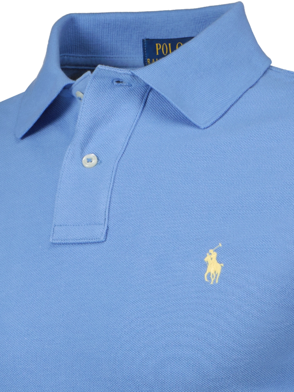 Licht blauwe polo van Polo Ralph Lauren, 100% katoen. Deze pique polo heeft een slim fit pasvorm. Op de borst staat een licht gele polo player geborduurd.