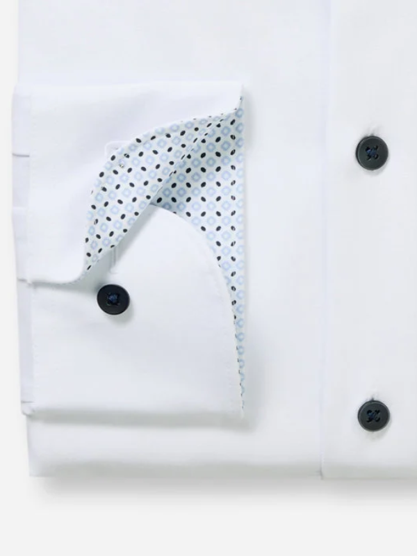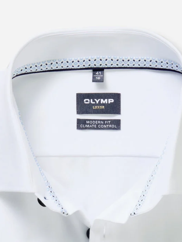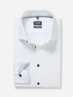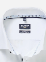 Wit overhemd met extra lange mouw lengte van Olymp, modern fit pasvorm. Het shirt is strijkvrij en gemaakt van 64% katoen, 27% polyester en 9% elastan. Leuke blauwe knoop en binnenzijde mouw en kraag met blauw afgewerkt.