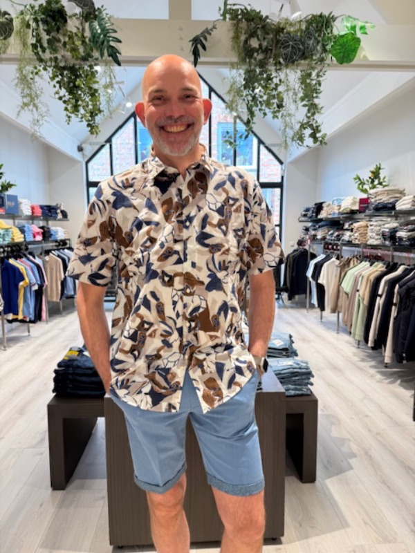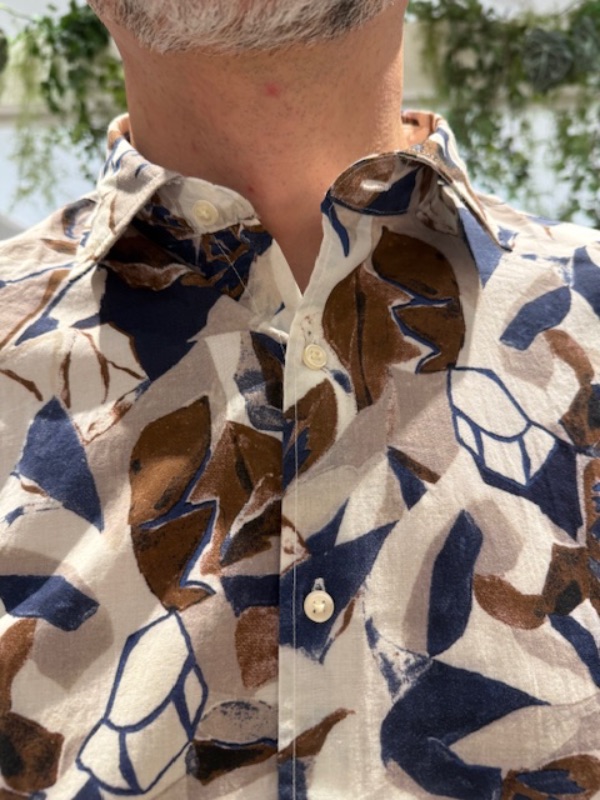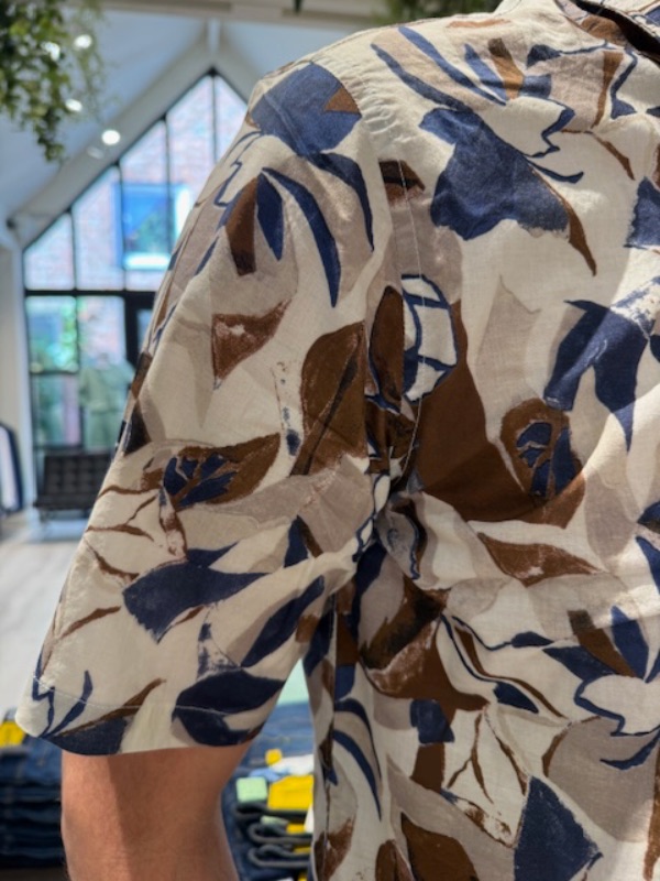 Beige korte mouw overhemd van Le Canard. Het shirt valt wat korter, leuk om over de broek te dragen. Het shirt heeft een beige met bruin en blauwe bladerprint. Het shirt is gemaakt van 100% katoen. Shirt valt onder de 2 voor 100 euro special.