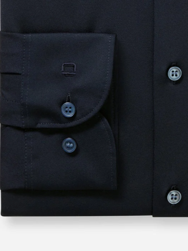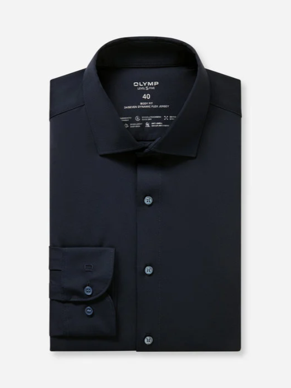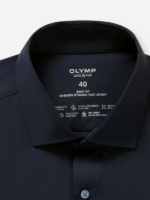 Navy blauw stretch overhemd van Olymp, body fit pasvorm. 24/seven dynamic flex jersey. Het overhemd draagt heerlijk.