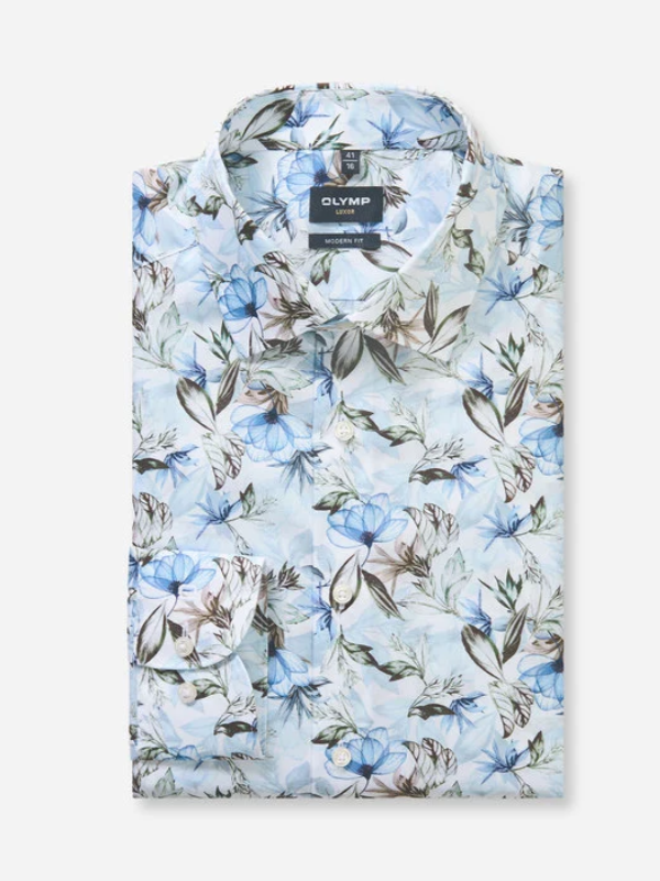 Wit overhemd van Olymp, modern fit pasvorm. Het shirt heeft een bloemenprint over het gehele shirt staan. Het overhemd heeft een button-down en is gemaakt van 100% katoen. Strijkvrij!!