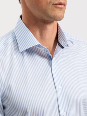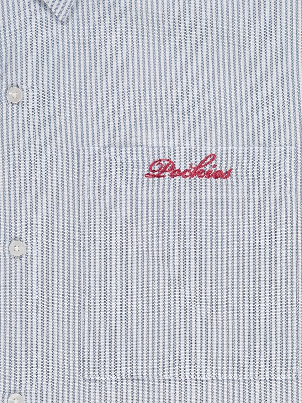 Blauw met wit gestreept shirt met korte mouw van Pockies. Het shirt heeft een kort model en is gemaakt van 100% katoen. Het shirt wordt gemaakt in Portugal. Op de borst zit een borstzak.