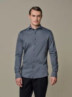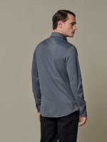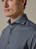 Grijs blauw overhemd slim fit van Japanese knitted kwaliteit. Mix van katoen en hightech garen voor de elegantie van een overhemd met het comfort van een t-shirt. Gebreide stof maakt strijken overbodig. Stof gebreid in Japan. Ascolite-technologie garandeert vaste knopen die stevig bevestigd blijven. Slim fit met extra cutaway kraag.