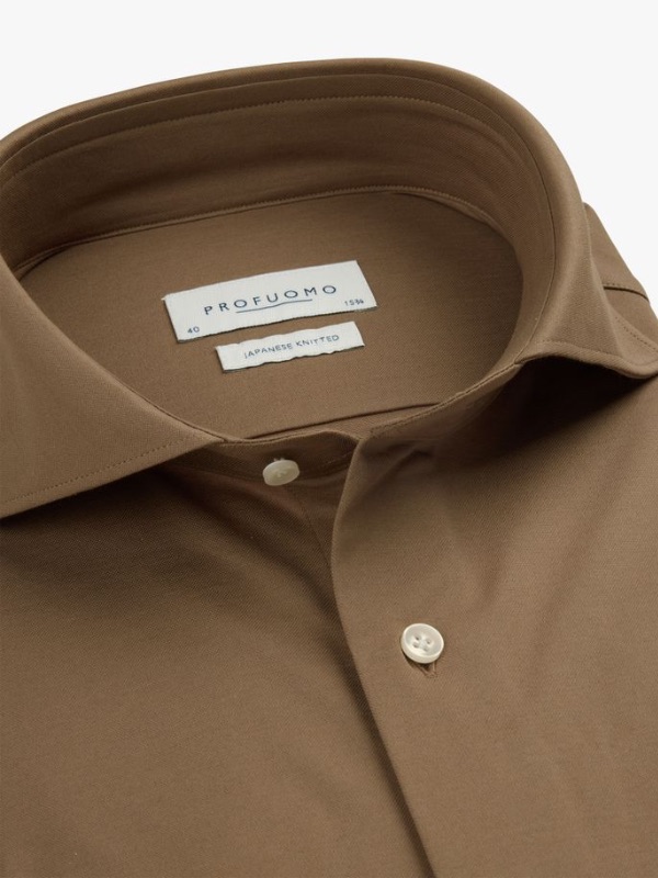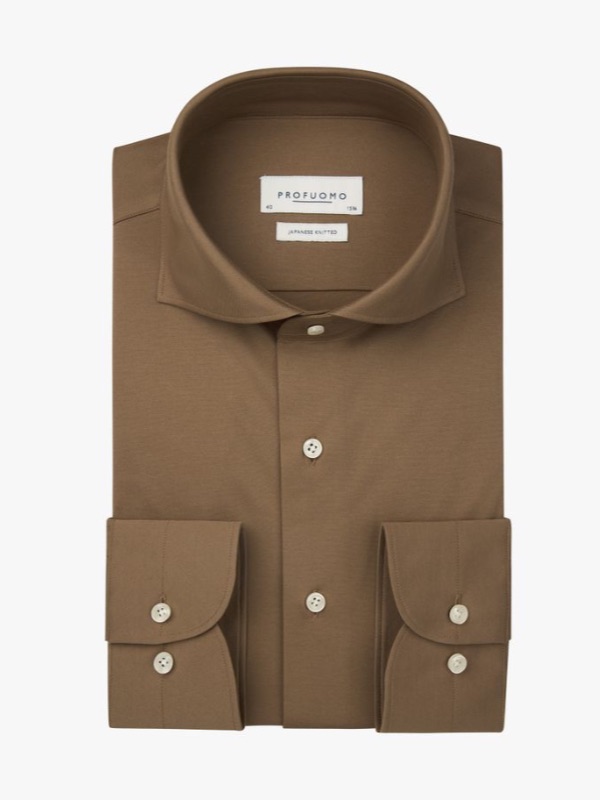 Camel kleurig japanese knitted overhemd van Profuomo, slim fit model. Top overhemd, als je deze kwaliteit hebt gehad, wil je niet anders meer. Het shirt is gemaakt van 50% katoen en 50% polyester. Draagt heerlijk, kreuk niet en is ademend. Strijkvrij!! Artikelnummer PPWH30026 van Profuomo.