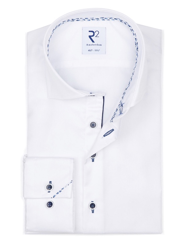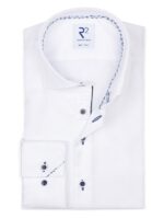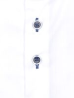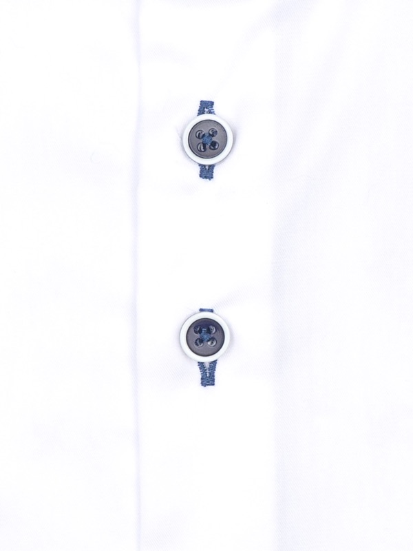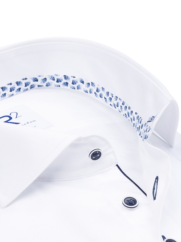 Dit shirt is gemaakt van biologisch katoen. Het shirt heeft een vrolijk versierde rand aan de binnenkant van de boord, en een kleurrijk detail op de manchetten. De knopen zijn in de kleuren van de rand in het boord. De kraag is widespread en de manchetten enkel. Het shirt heeft een slim fit pasvorm.
