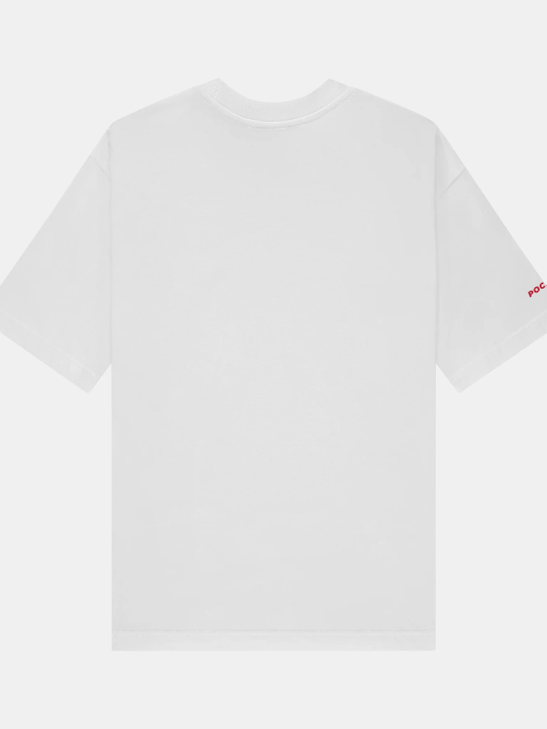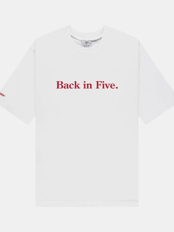Wit t-shirt van Pockies in regular fit pasvorm. Op het t-shirt staat Back in Five. Het t-shirt is gemaakt van 100% katoen in Portugal.