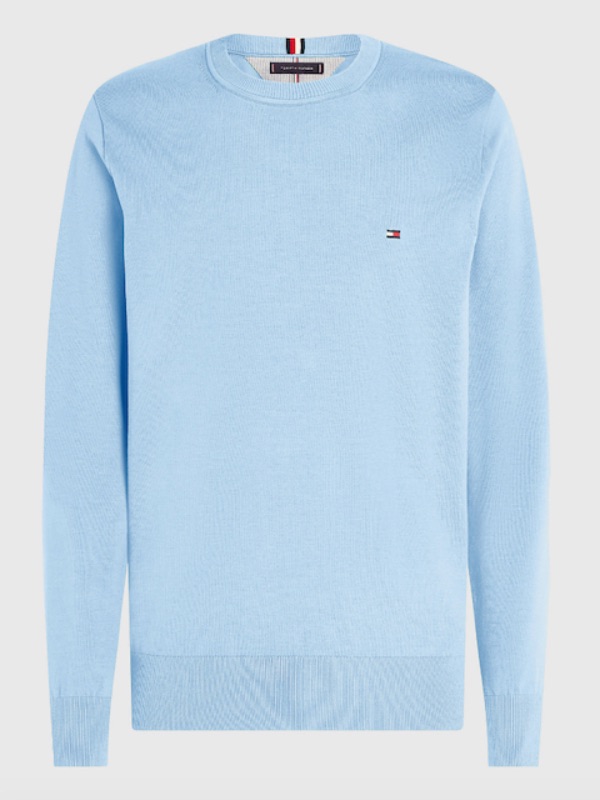 Licht blauwe ronde hals trui van Hilfiger, slimfit model. De trui is gemaakt van 81% katoen en 19% polyester.