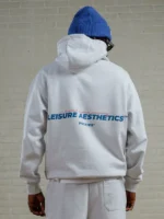 Grijze hoodie van Pockies, de sweater valt groot uit. Zeker een maat, maar wordt ook ruim gedragen. Op de achterzijde staat LEISURE AESTHETICS. Gemaakt van 100% katoen.