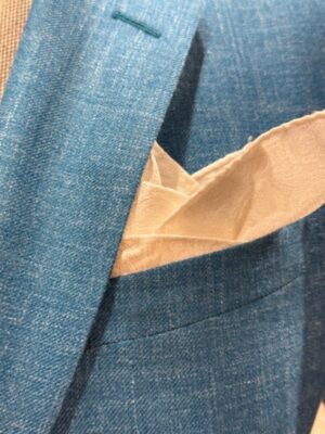 Dit is een voorbeeld van een maatpak. Dit roze maatpak met enkele knoop is gemaakt van een wollen kwaliteit. Bij een maatpak zijn er veel opties om uit te kiezen: 1. De stof 2. De voering 3. Het model 4. Het rever 5. De zakken 6. Tekst in de kraag en aan de binnenzijde van het colbert 7. Type broek 8. Knoop 9. Kraagvilt 10.Slim fit pasvorm of regular fit. 11.Half-canvas of full-canvas 12.2-delig of 3-delig 13.Enkele rij of dubbele rij knopen. Er zijn nog veel meer optie’s. We nemen de maten en dan wordt er een patroon gemaakt. Aan de hand daarvan wordt een pak gemaakt. De stoffen komen uit Italie en het pak wordt geproduceerd in Europese ateliers. De prijzen zijn vanaf 798.-, dit voorbeeld is een schatting van de prijs. Interesse? Neem contact op met Olaf of Rosalie. Bel met 0229-215426.