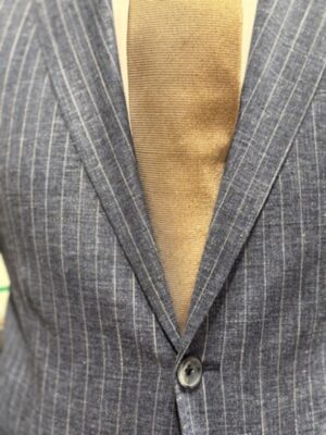Het pak heeft een Italiaanse brede opgesneden rever, deze opgesneden rever zit ook op het gilet. Het gilet heeft rondom dezelfde stof. Dus geen voeringstof aan de achterkant. De zakken zijn schuin opgezet.